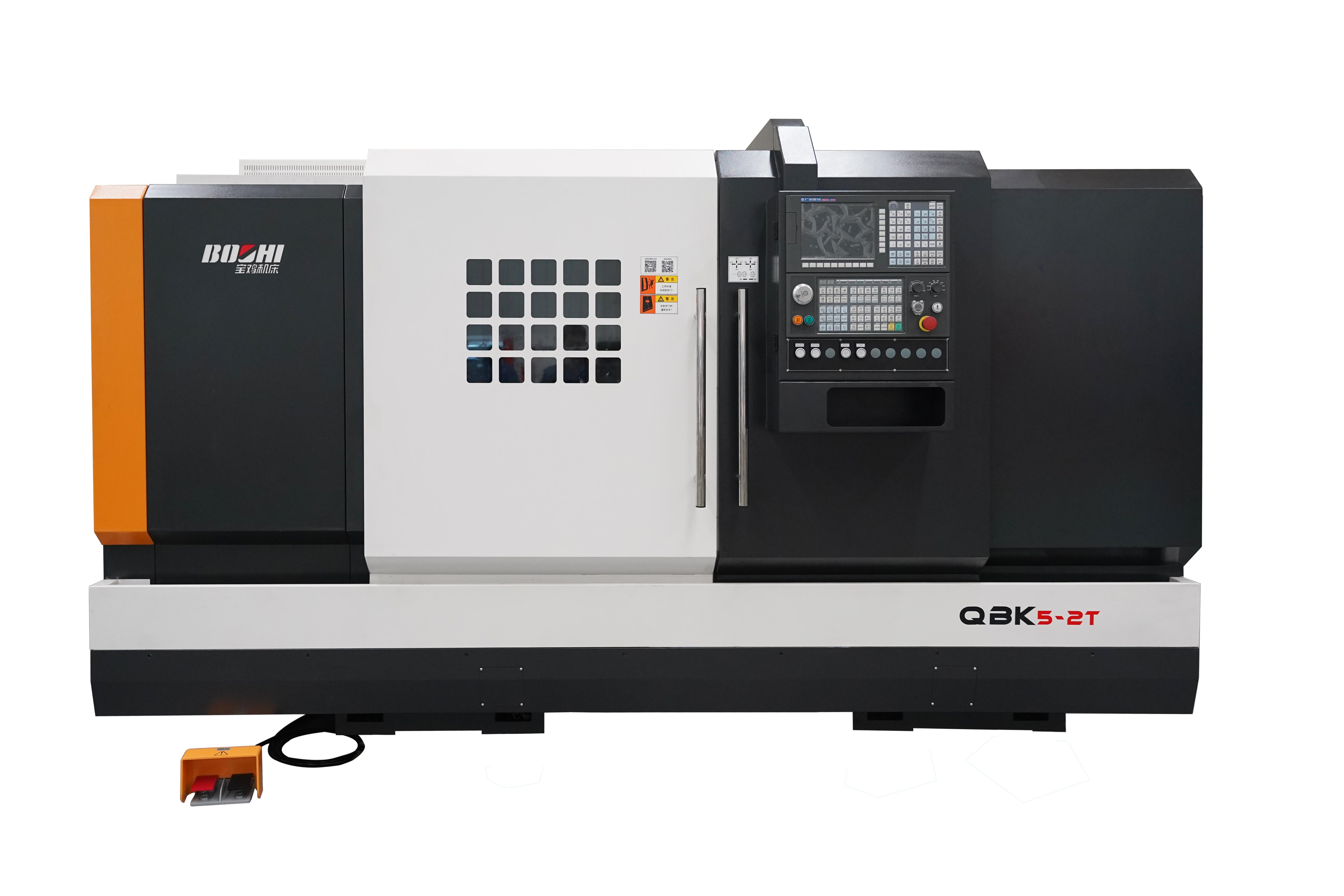 QBK5-2T數(shù)控車(chē)床是針對(duì)風(fēng)電領(lǐng)域所用緊固螺栓加工而開(kāi)發(fā)的一款中間驅(qū)動(dòng)數(shù)控車(chē)床,該車(chē)床采用兩個(gè)單側(cè)液壓驅(qū)動(dòng)筒夾夾持工件中部,左右兩側(cè)各配置一組排式刀架,通過(guò)兩側(cè)刀具同時(shí)車(chē)削,實(shí)現(xiàn)對(duì)工件的一次裝夾,完成兩端外圓、端面的高效加工。為適用不同長(zhǎng)度工件加工需求,兩側(cè)夾頭間距可通過(guò)程序控制實(shí)現(xiàn)自動(dòng)調(diào)整,方便快捷。